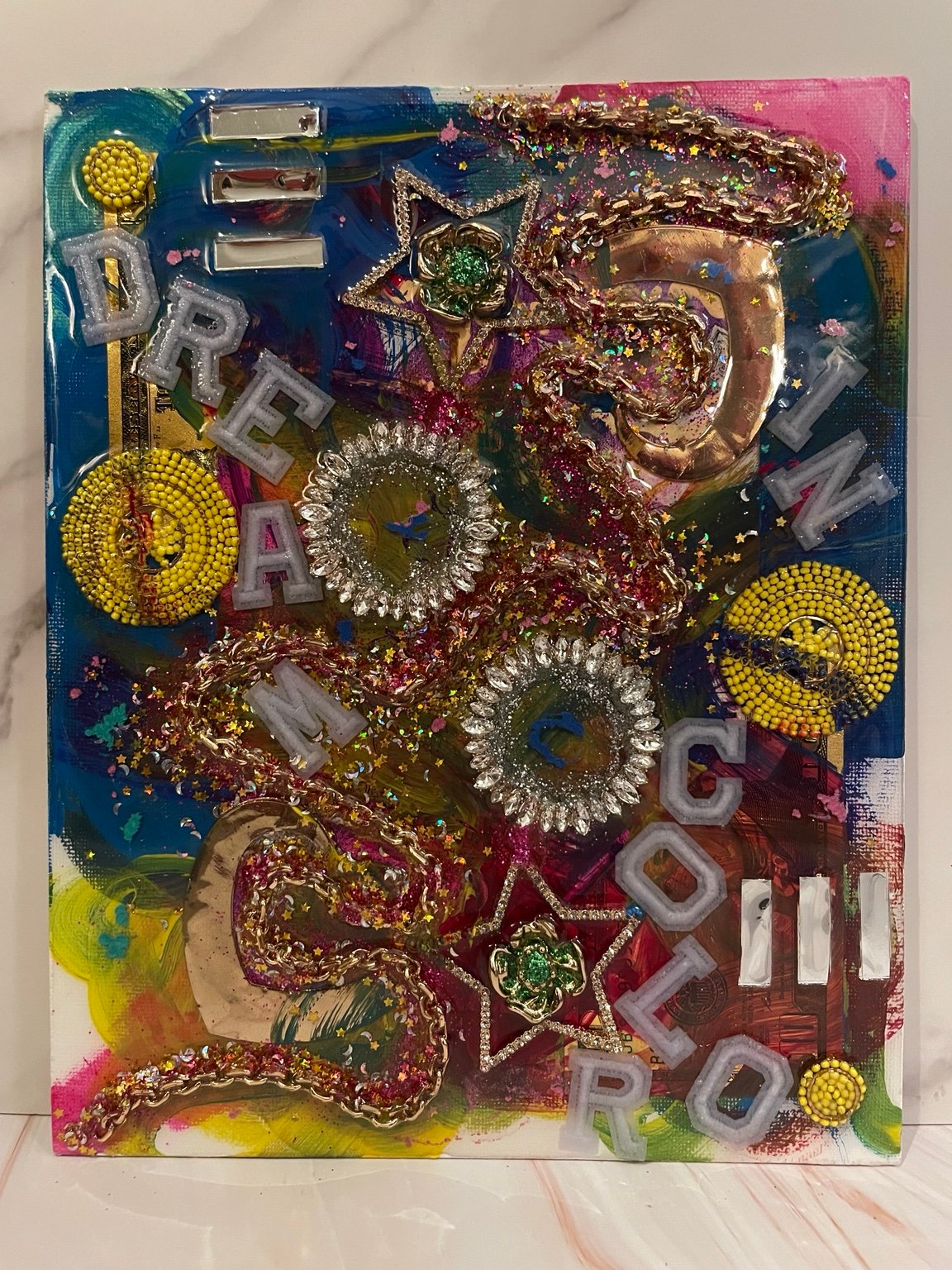 This piece blends bold color, texture, typography, and dimensional embellishments to create a statement that is both visual and emotional. The layered materials and vibrant movement reflect the complexity of self—loud, evolving, and unapologetically present.