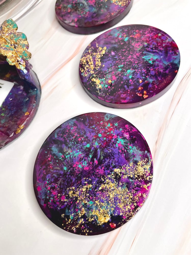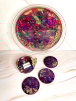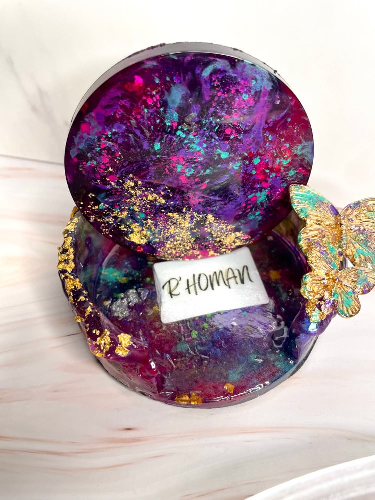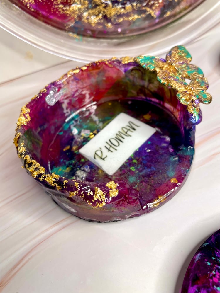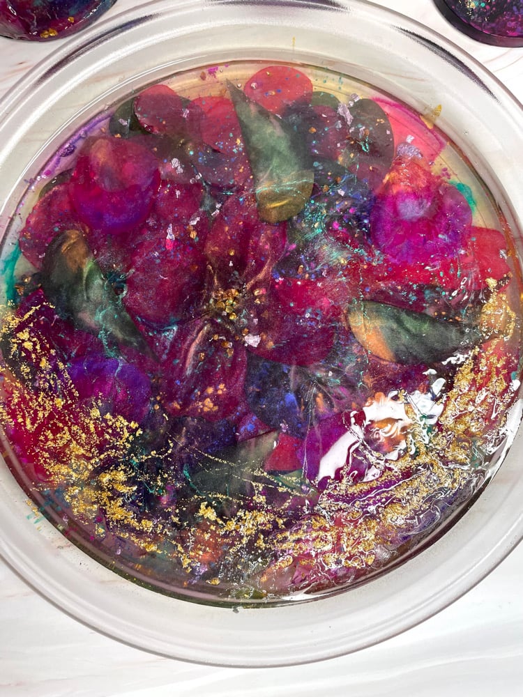 - Resin, gold leaf, floral inclusions, shimmer pigments