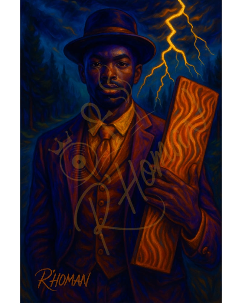 A suited man stands under lightning with a glowing plank in his arms, caught between storm and purpose—closing one door while carrying the next.
