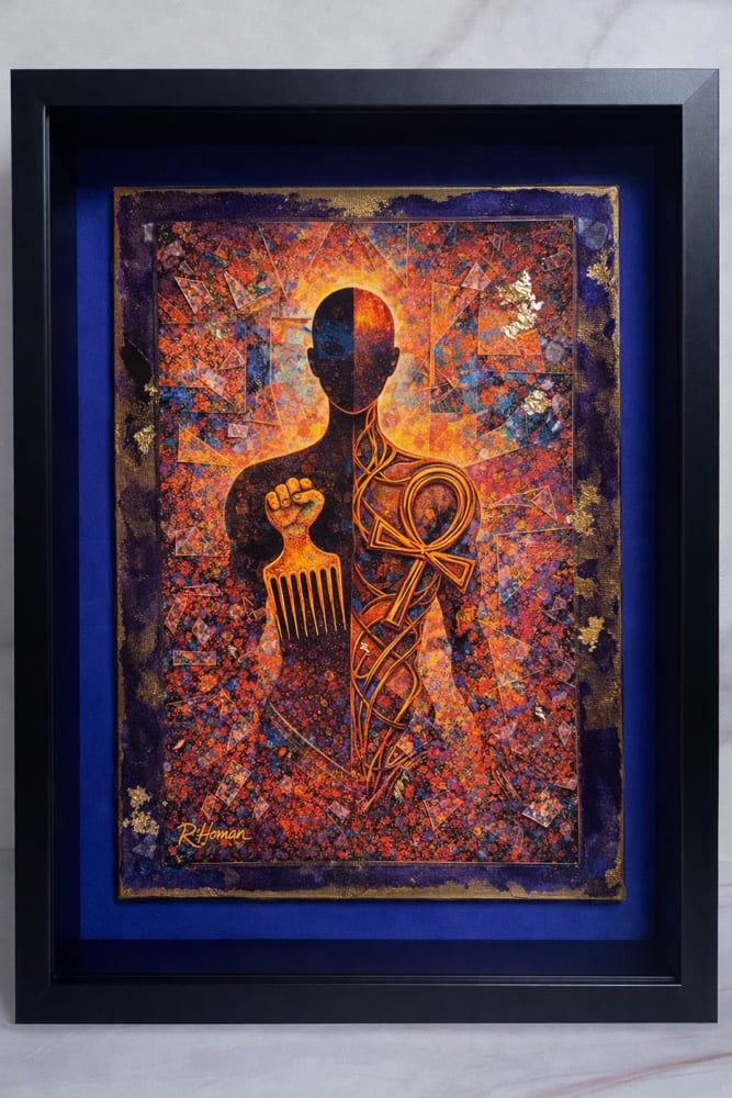 Each piece explores identity through contrast and symbolism—blending ancestral references, cultural markers, and abstract pattern work into a unified visual language. The central figures are divided yet complete, representing the coexistence of strength, heritage, and personal evolution.