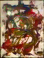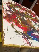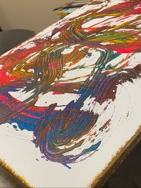 Entangled Vision is an 18 × 24 mixed-media abstract paneldefined by sweeping textured strokes layered with reflectivepigment. The artist uses directional grooves and layeredcolor to create movement that feels almost musical inrhythm. Metallic tones and glitter interact with light acrossthe surface, shifting the painting’s energy depending onviewing angle.The gold-painted edges frame the composition and elevatethe piece into a finished object, giving the work a sense ofstrength and intention while allowing the expressive interiorto remain raw and alive.The result is a piece that balances control and instinct—anabstract composition that invites viewers to discover theirown imagery within the entangled motion.