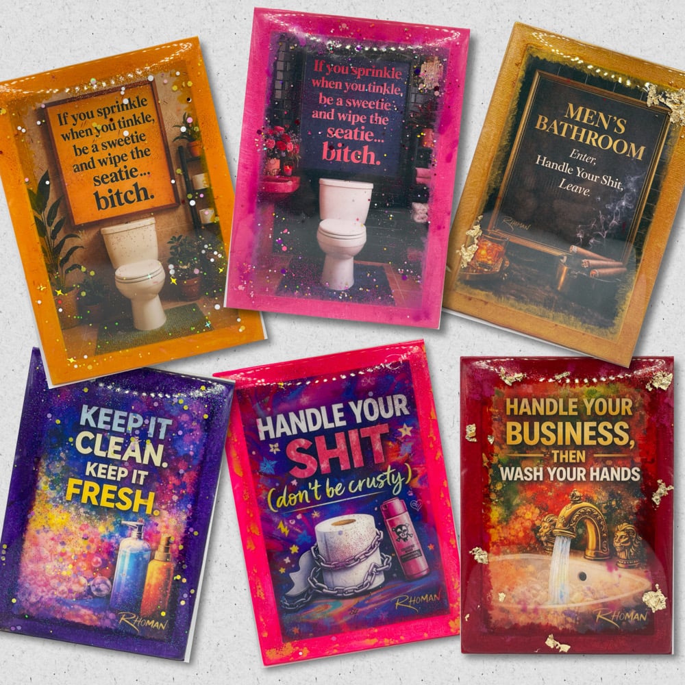 Handle Your Business — The Bathroom Series is a set of bold, handcrafted resin signs designed to bring personality, humor, and presence into everyday spaces.