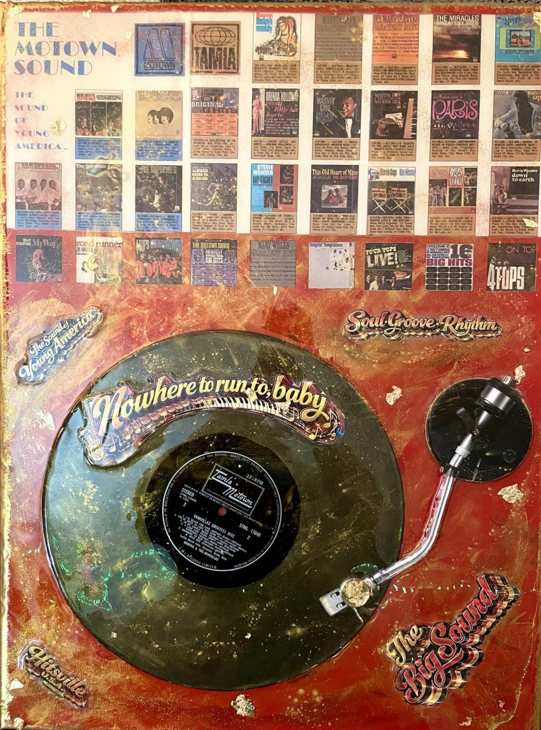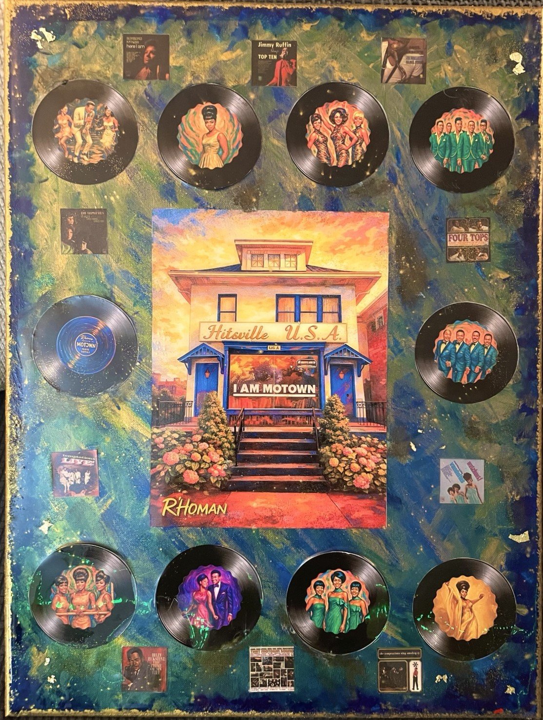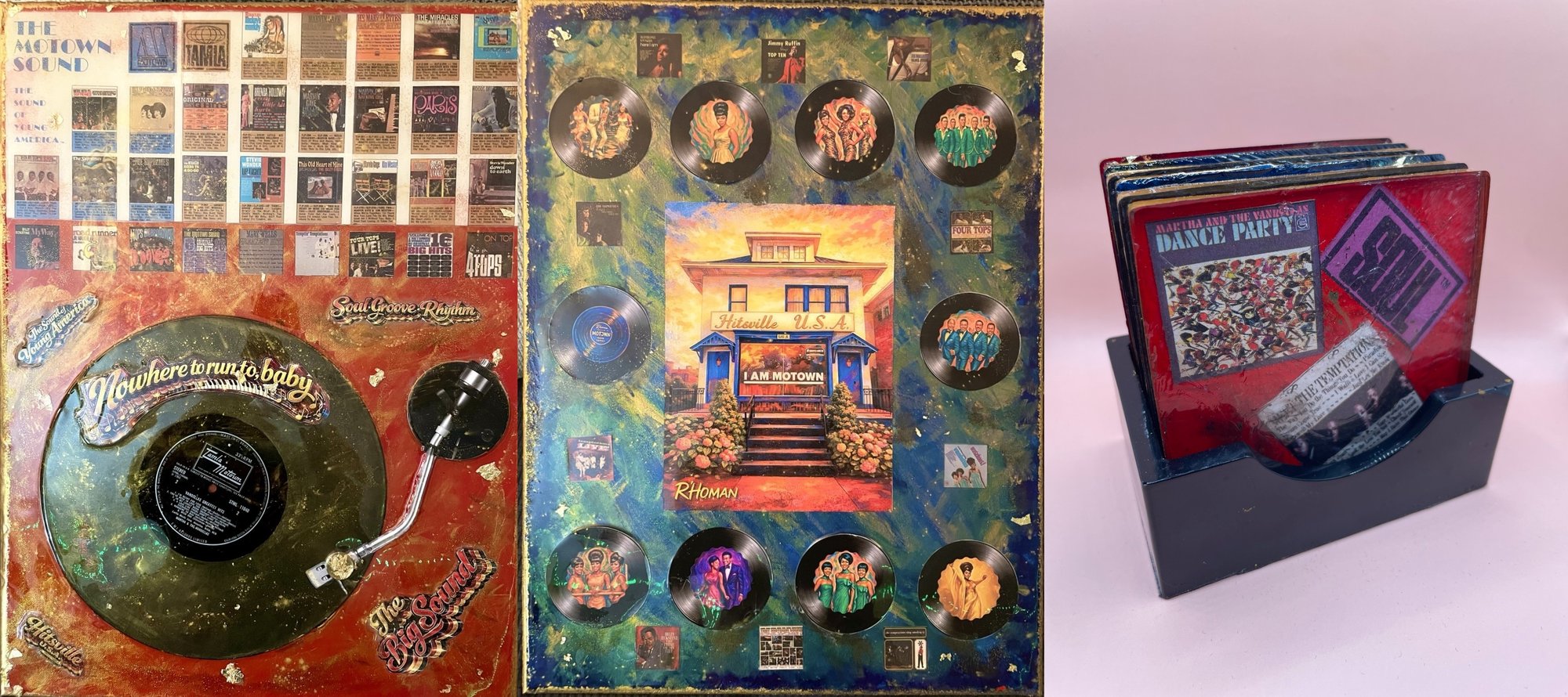 Each canvas is richly layered with Motown-inspired visuals, vinyl elements, and archival-style imagery, sealed in a high-gloss resin finish that enhances depth, color, and preservation.