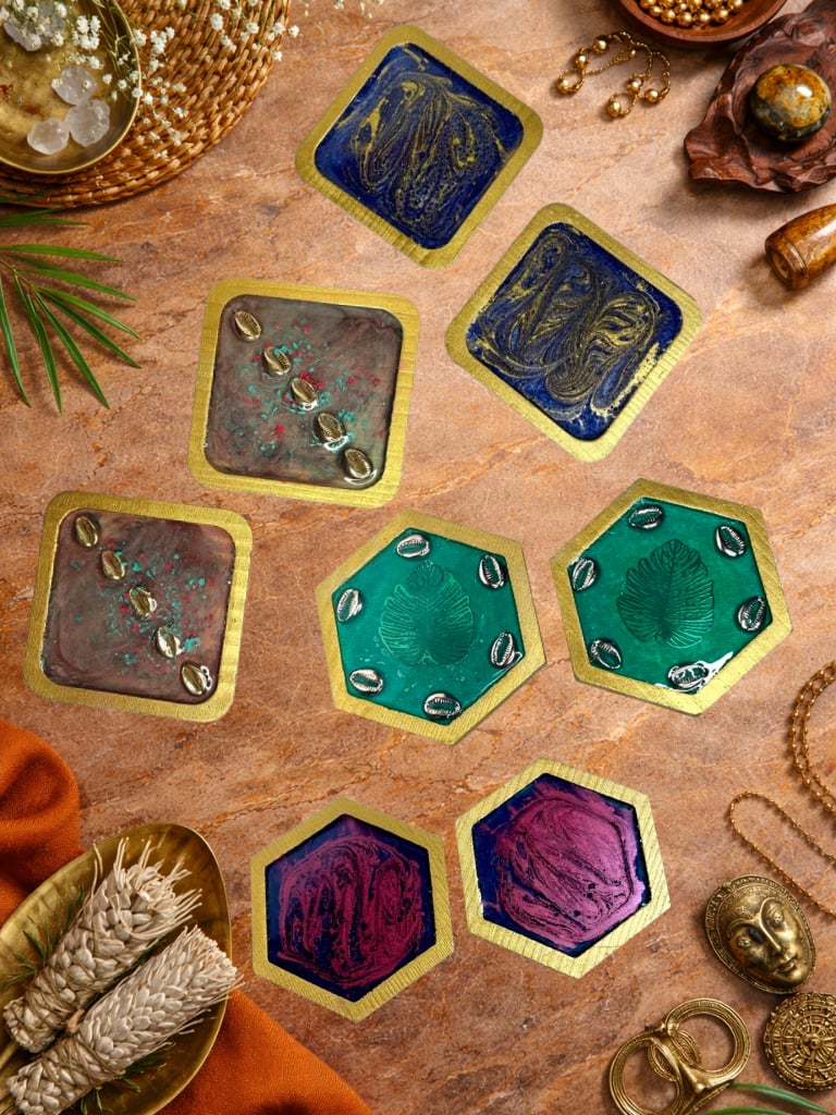 A curated collection of handcrafted wood and resin coasters — where texture, tone, and intention meet. Each pair is built on a solid wood base and finished with layered resin, metallic accents, and signature R’homan detailing.
