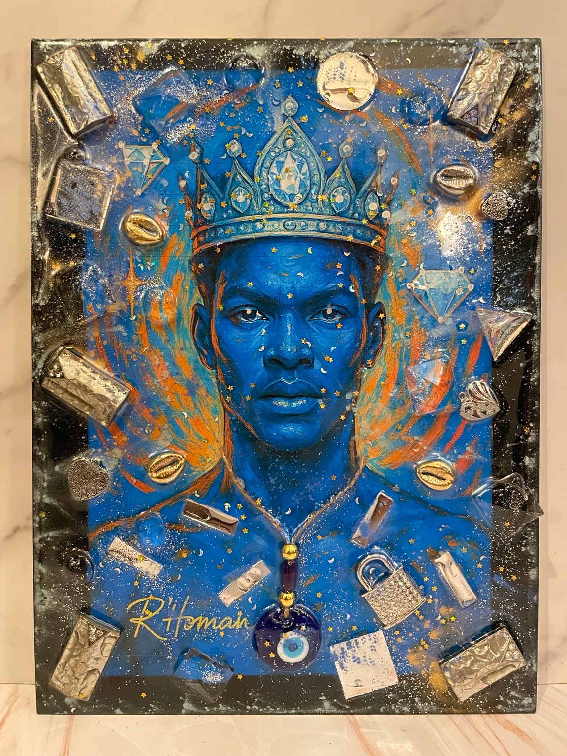 The use of blue tones, celestial elements, and symbolic adornments reflects intuition, protection, and higher consciousness.