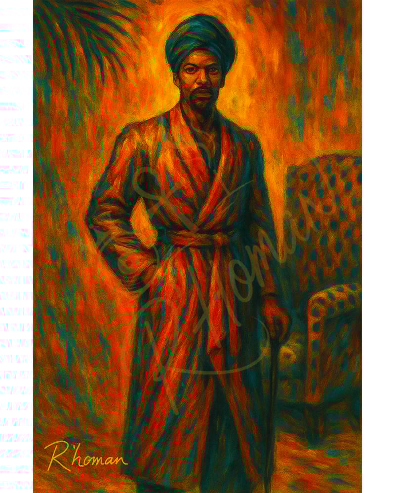 A man draped in a fiery orange robe and turban, standing calmly in a warm, textured room filled with heat and mystery.